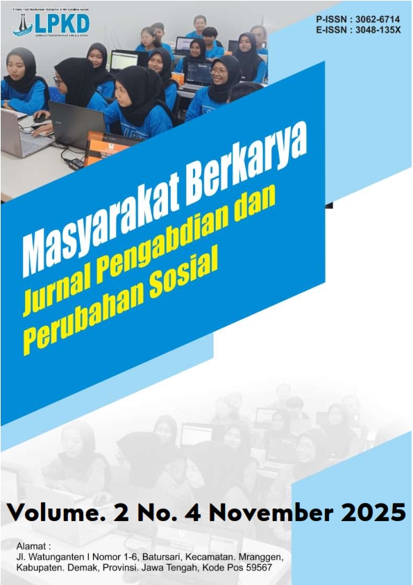 Vol. 2 No. 4 (2025)Masyarakat Berkarya : Jurnal Pengabdian dan Perubahan Sosial adalah jurnal yang menerima artikel dalam bahasa Inggris dan bahasa Indonesia . Print ISSN : 3062-6714, Online ISSN : 3048-135X. Focus dan Scope pada bidang pendidikan, Hukum, Ekonomi, Humaniora, Teknik, Pertanian, Komunikasi, Kesehatan, dan Rekayasa. Masyarakat Berkarya : Jurnal Pengabdian dan Perubahan Sosial memuat publikasi hasil kegiatan pengabdian masyarakat, model atau konsep dan atau implementasinya dalam rangka peningkatan partisipasi masyarakat dalam pembangunan, pemberdayaan masyarakat atau pelaksanaan pengabdian kepada masyarakat. Masyarakat Berkarya : Jurnal Pengabdian dan Perubahan Sosial, terbit 1 tahun 4 kali (Februari, Mei, Agustus dan November)