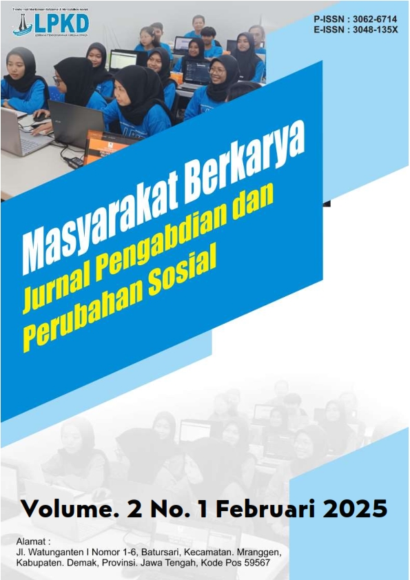 Vol. 2 No. 1 (2025)Masyarakat Berkarya : Jurnal Pengabdian dan Perubahan Sosial adalah jurnal yang menerima artikel dalam bahasa Inggris dan bahasa Indonesia . Print ISSN : 3062-6714, Online ISSN : 3048-135X. Focus dan Scope pada bidang pendidikan, Hukum, Ekonomi, Humaniora, Teknik, Pertanian, Komunikasi, Kesehatan, dan Rekayasa. Masyarakat Berkarya : Jurnal Pengabdian dan Perubahan Sosial memuat publikasi hasil kegiatan pengabdian masyarakat, model atau konsep dan atau implementasinya dalam rangka peningkatan partisipasi masyarakat dalam pembangunan, pemberdayaan masyarakat atau pelaksanaan pengabdian kepada masyarakat. Masyarakat Berkarya : Jurnal Pengabdian dan Perubahan Sosial, terbit 1 tahun 4 kali (Februari, Mei, Agustus dan November)