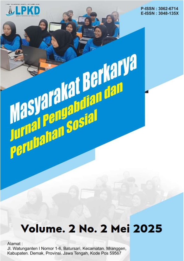 Vol. 2 No. 3 (2025)Masyarakat Berkarya : Jurnal Pengabdian dan Perubahan Sosial adalah jurnal yang menerima artikel dalam bahasa Inggris dan bahasa Indonesia . Print ISSN : 3062-6714, Online ISSN : 3048-135X. Focus dan Scope pada bidang pendidikan, Hukum, Ekonomi, Humaniora, Teknik, Pertanian, Komunikasi, Kesehatan, dan Rekayasa. Masyarakat Berkarya : Jurnal Pengabdian dan Perubahan Sosial memuat publikasi hasil kegiatan pengabdian masyarakat, model atau konsep dan atau implementasinya dalam rangka peningkatan partisipasi masyarakat dalam pembangunan, pemberdayaan masyarakat atau pelaksanaan pengabdian kepada masyarakat. Masyarakat Berkarya : Jurnal Pengabdian dan Perubahan Sosial, terbit 1 tahun 4 kali (Februari, Mei, Agustus dan November)