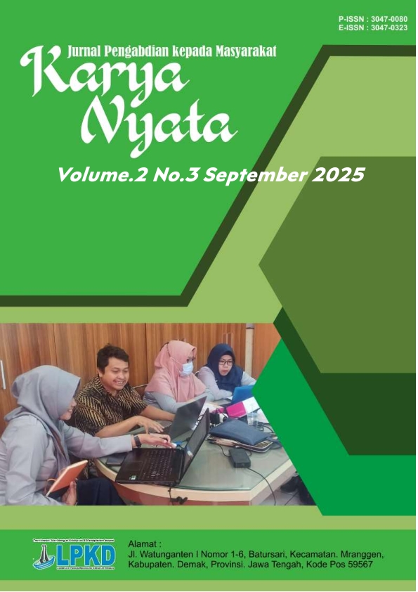 Vol. 2 No. 3 (2025)Karya Nyata : Jurnal Pengabdian kepada Masyarakat adalah jurnal yang menerima artikel dalam bahasa Inggris dan bahasa Indonesia . Print ISSN : 3047-0080, Online ISSN : 3047-0323.Focus dan Scope pada bidang pendidikan, Hukum, Ekonomi, Humaniora, Teknik, Pertanian, Komunikasi, Kesehatan, dan Rekayasa. Karya Nyata : Jurnal Pengabdian kepada Masyarakat memuat publikasi hasil kegiatan pengabdian masyarakat, model atau konsep dan atau implementasinya dalam rangka peningkatan partisipasi masyarakat dalam pembangunan, pemberdayaan masyarakat atau pelaksanaan pengabdian kepada masyarakat. Karya Nyata : Jurnal Pengabdian kepada Masyarakat , terbit 1 tahun 4 kali (Maret, Juni, September dan Desember)