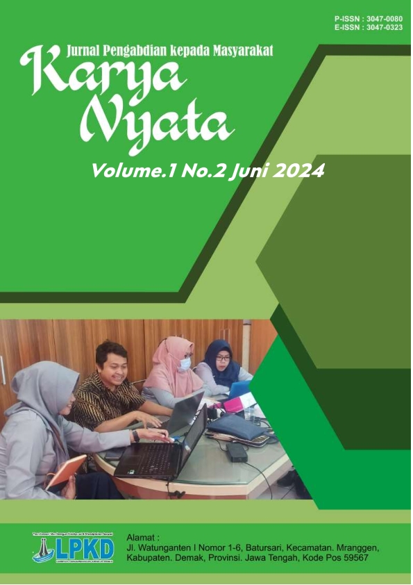 Vol. 1 No. 3 (2024)Karya Nyata : Jurnal Pengabdian kepada Masyarakat adalah jurnal yang menerima artikel dalam bahasa Inggris dan bahasa Indonesia . Print ISSN : 3047-0080, Online ISSN : 3047-0323.Focus dan Scope pada bidang pendidikan, Hukum, Ekonomi, Humaniora, Teknik, Pertanian, Komunikasi, Kesehatan, dan Rekayasa. Karya Nyata : Jurnal Pengabdian kepada Masyarakat memuat publikasi hasil kegiatan pengabdian masyarakat, model atau konsep dan atau implementasinya dalam rangka peningkatan partisipasi masyarakat dalam pembangunan, pemberdayaan masyarakat atau pelaksanaan pengabdian kepada masyarakat. Karya Nyata : Jurnal Pengabdian kepada Masyarakat , terbit 1 tahun 4 kali (Maret, Juni, September dan Desember)