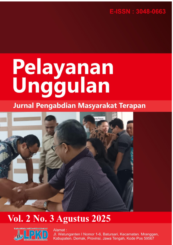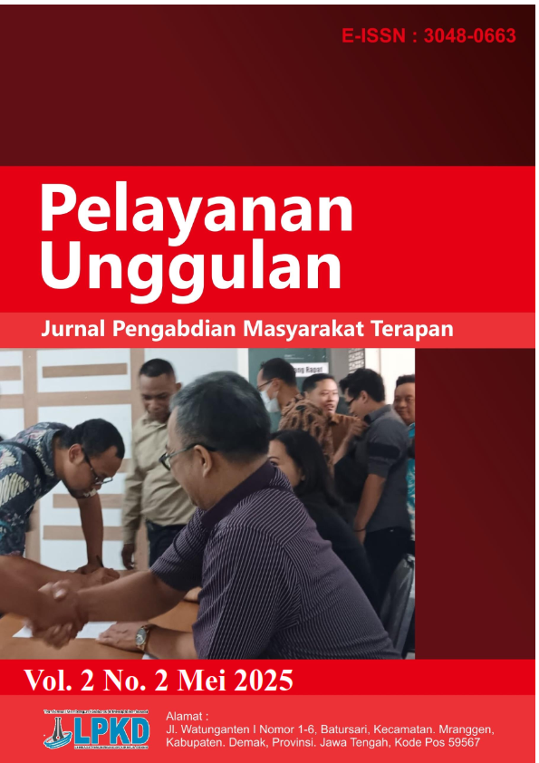 Pelayanan Unggulan : Jurnal Pengabdian Masyarakat Terapan adalah jurnal yang menerima artikel dalam bahasa Inggris dan bahasa Indonesia . Online ISSN 3048-0663.Focus dan Scope pada bidang pendidikan, Hukum, Ekonomi, Humaniora, Teknik, Pertanian, Komunikasi, Kesehatan, dan Rekayasa. Pelayanan Unggulan : Jurnal Pengabdian Masyarakat Terapan memuat publikasi hasil kegiatan pengabdian masyarakat, model atau konsep dan atau implementasinya dalam rangka peningkatan partisipasi masyarakat dalam pembangunan, pemberdayaan masyarakat atau pelaksanaan pengabdian kepada masyarakat. Pelayanan Unggulan : Jurnal Pengabdian Masyarakat Terapan, terbit 1 tahun 4 kali (Februari, Mei, Agustus dan November)